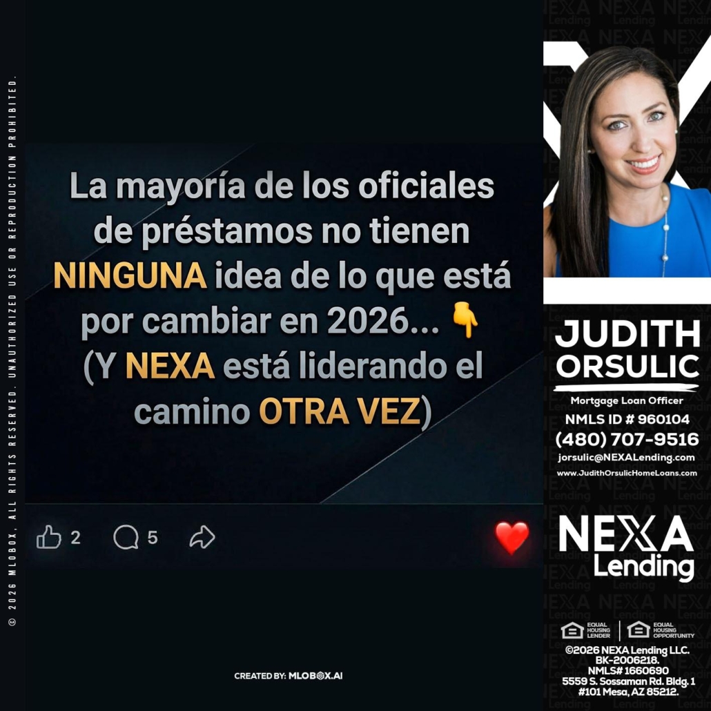 la mayoría de - Judith Orsulic -Mortgage Loan OfficerHi, my name is Judith Orsulic. I’m a Loan Officer with NEXA Mortgage, offering personalized mortgage solutions, fast customized quotes, great rates and service with integrity.